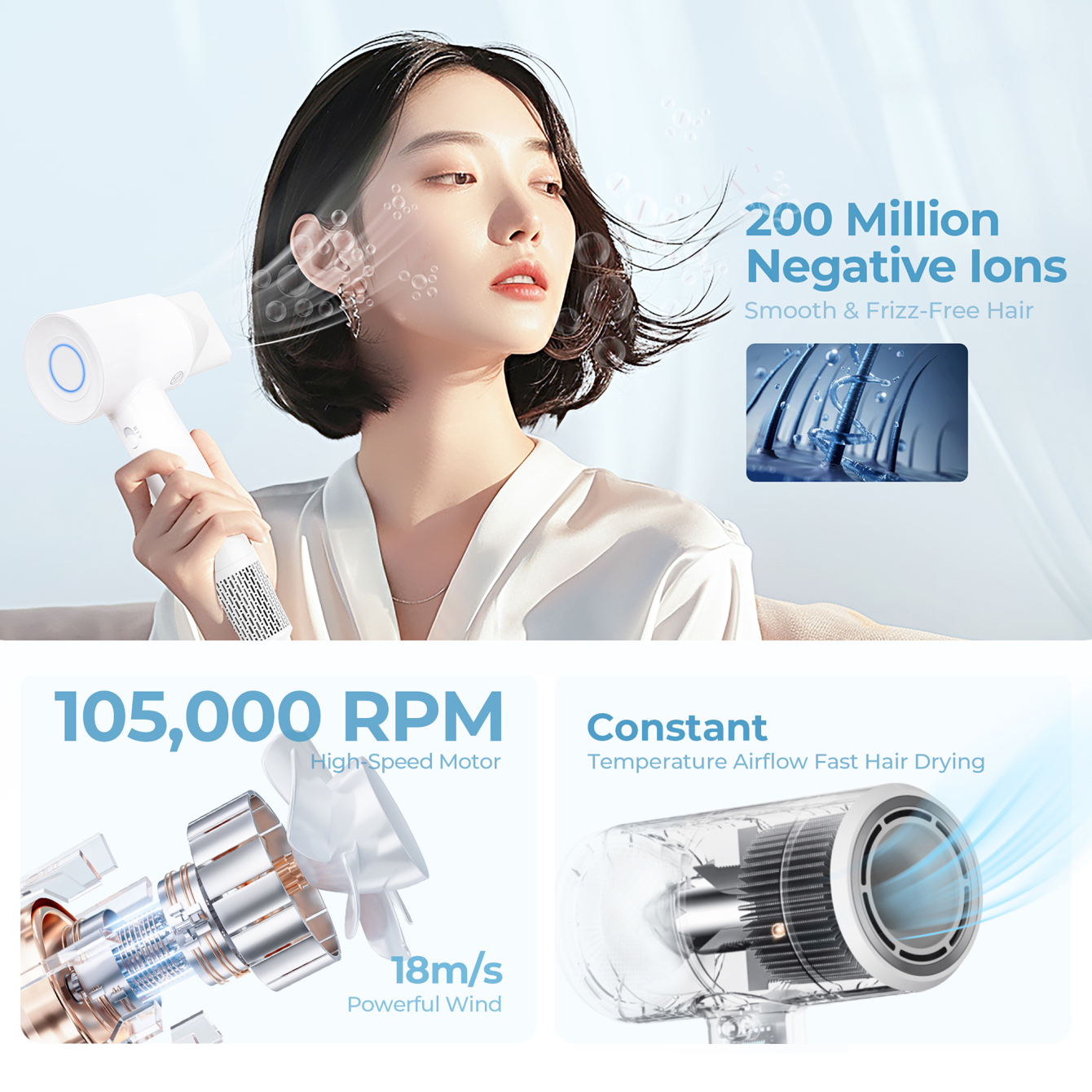 Оснащений інтелектуальною технологією контролю температури, яка допомагає зберігати вологу та природну структуру волосся, запобігаючи його сухості та ламкості.