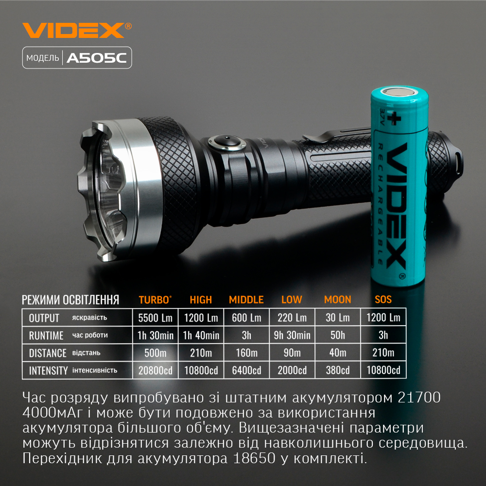 TURBO mode-maximum brightness mode with the highest light brightness of 5500Lm. The lighting distance is 500m.the duration of operation is 1 hour. 30 min. The luminous flux intensity is 20800cd.