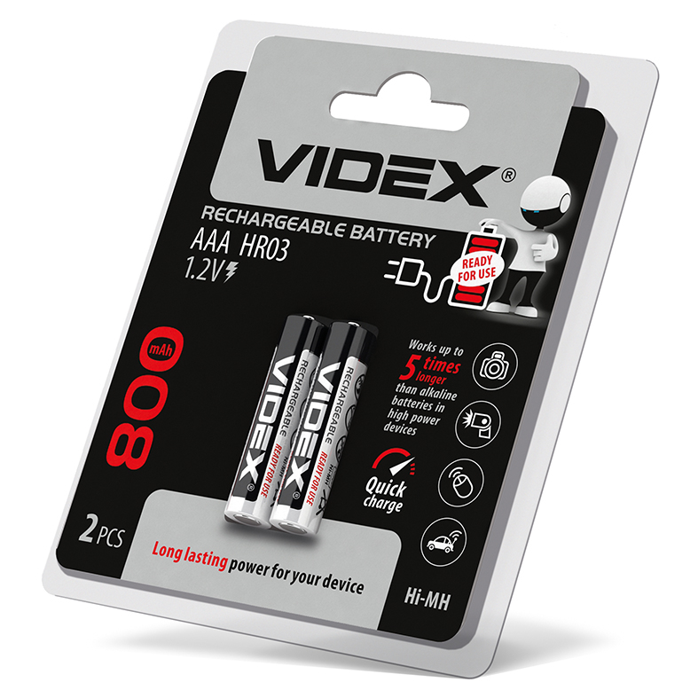 Нікель-метал-гідридні (Ni-MH) акумулятори VIDEX є високоякісним джерелом живлення і мають тривалий строк служби. Цей тип акумуляторів використовується в переносних електроприладах і інструментах. З переваг даного типу акумуляторів необхідно відзначити швидкий заряд і тривалий строк служби. Наявність на упаковці позначення "READY FOR USЕ", говорить про готовність акумулятора до роботи відразу після розпакування. У випадку відсутності такого позначення, перед початком використання акумулятор потрібно зарядити. Застосовуються для будь-яких типів навантаження.