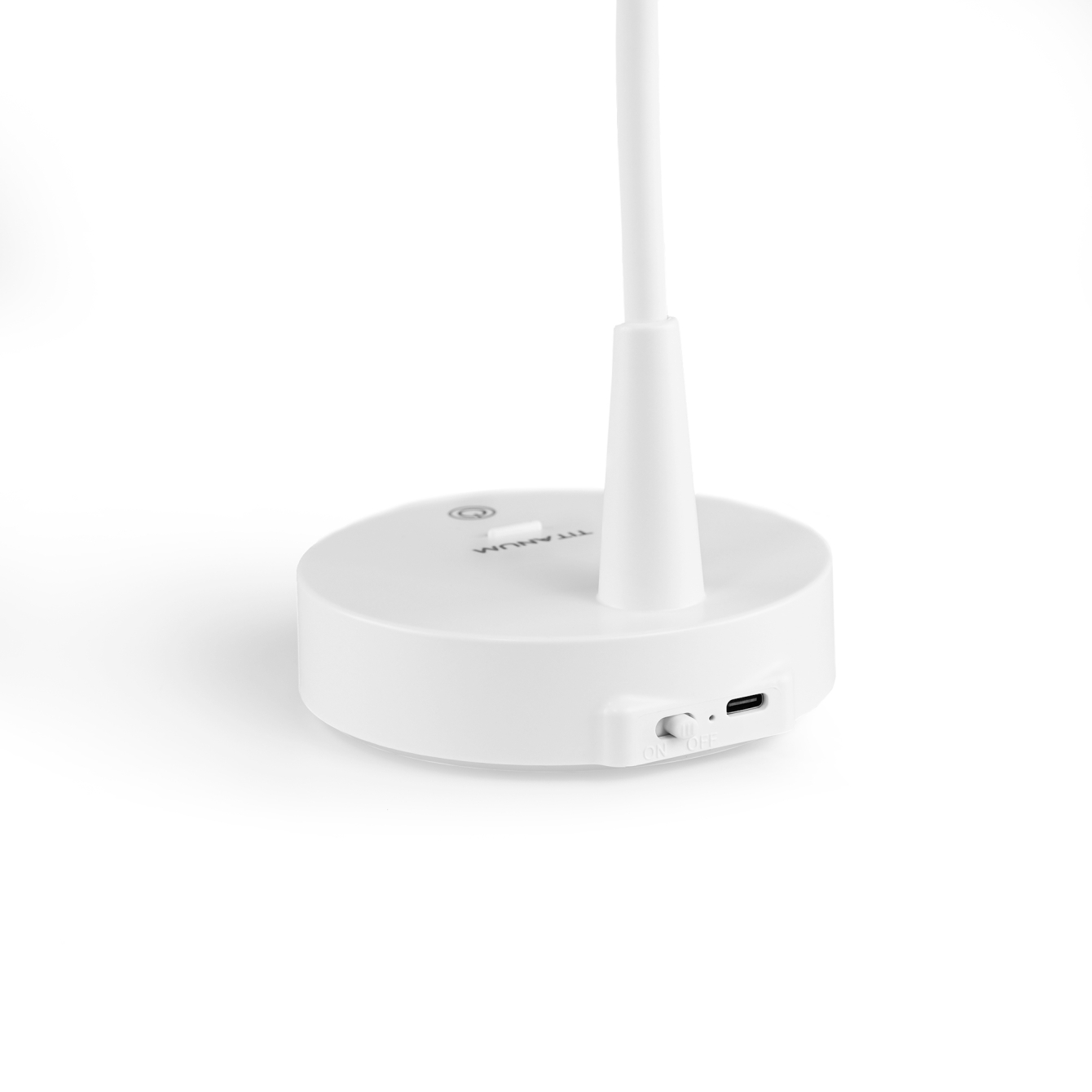 LED лампа настiльна з акумулятором TITANUM TLTF-012W 7W 3000-6000K – стильна та компактна лампа з можливістю регулювання яскравості та колірності. Лампа абсолютно безшумна, має в комплекті акумулятор та тривалий термін служби. Корпус виготовлений з екологічно безпечного якісного пластику білого кольору. Рухома конструкція ніжки лампи дозволяє скеровувати світло у потрібному напрямку. Розрахована для освітлення письмового чи робочого столу. Реалізована можливість регулювання яскравості та зміни колірності світла, що сприяє зменшенню навантаження на зір. Керування лампою здійснюється за допомогою сенсорної кнопки, розташованої на її корпусі. Додатково лампа слугує також в якості підставки для смартфона. Для цього на корпусі є спеціально відведене місце з бортиком.