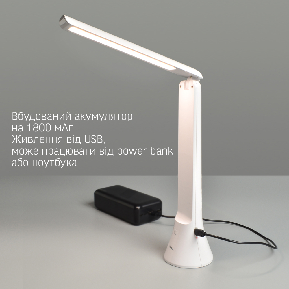 Настільна лампа VIDEX відмінно підійде для різного роду завдань, наприклад, для освітлення робочої зони столу, клавіатури, читання, письма, шиття, манікюру та інше. Лампа здатна працювати без підключення до побутової мережі живлення за рахунок вбудованої акумуляторної батареї (1800мА.год). Невеликі габарити дозволяють розміщувати лампу не займаючи зайвого місця. Робочий кут нахилу дає змогу зручно керувати лампою та спрямовувати світло згідно потреби. Завдяки вбудованому акумулятору може працювати до 6 годин в автономному режимі.