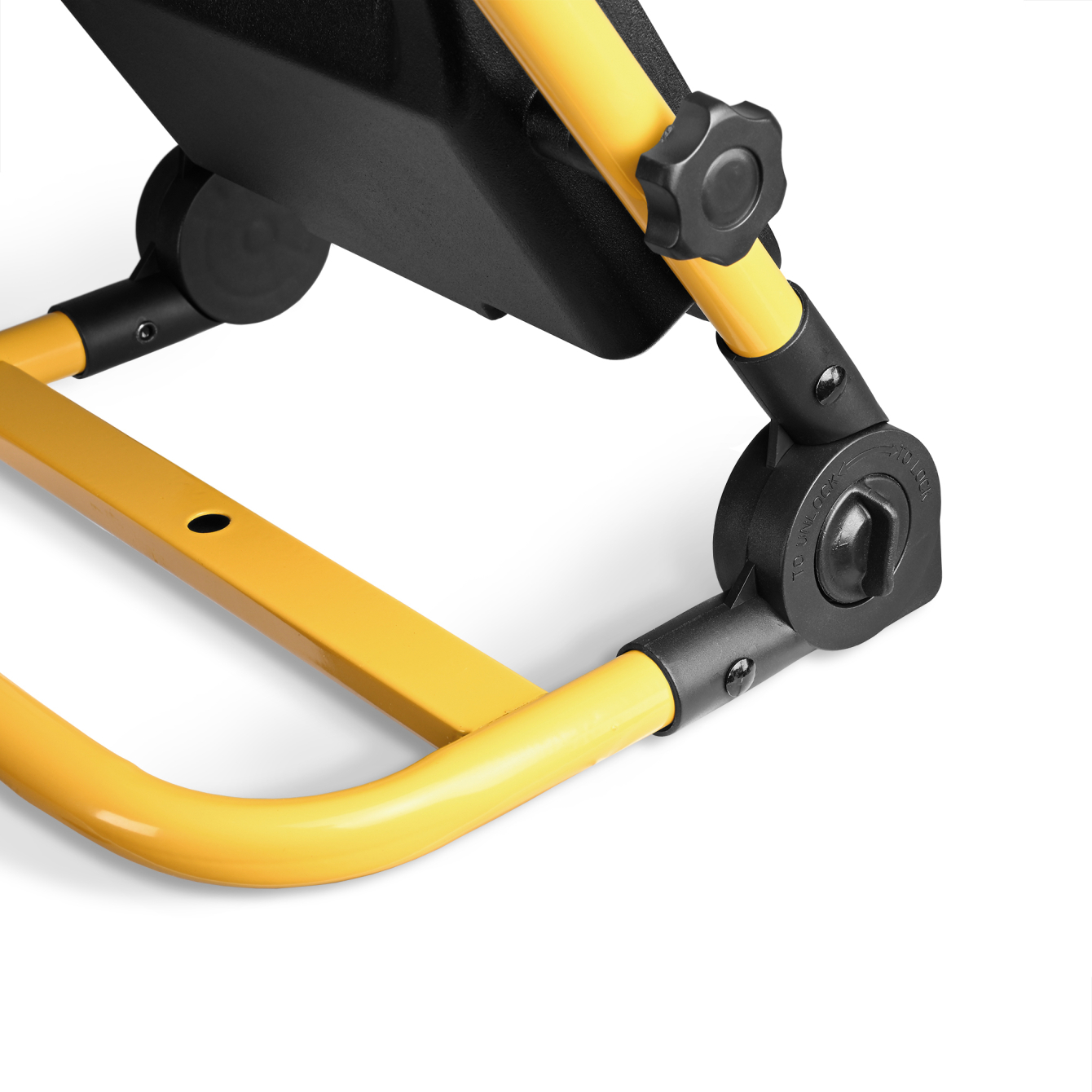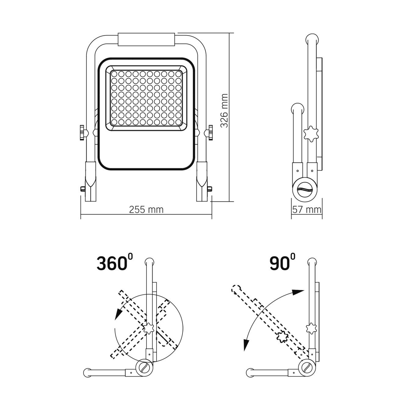 За допомою довготривалого натискання кнопки прожектор вимикається. Прожектор запам'ятовує попередні налаштування. Дозволяє змінити кут нахилу кронштейна на 90° та кут нахилу прожектора на 360° з метою забезпечення оптимального освітлення необхідної площини. Прожектор може перезаряджати акумулятор за допомогою кабелю. Заряд здійснюється за допомогою роз'єму та кабелю, що постачається у комплекті.