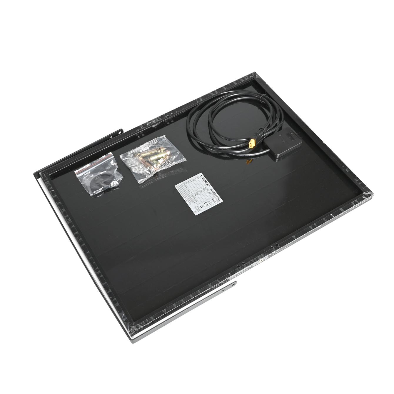 В комплект разом із прожектором входять: сонячна панель, пульт дистанційного керування, батарейка для нього (CR2032), монтажні болти та посібник користувача. Вага всього комплекту становить 4.37кг.