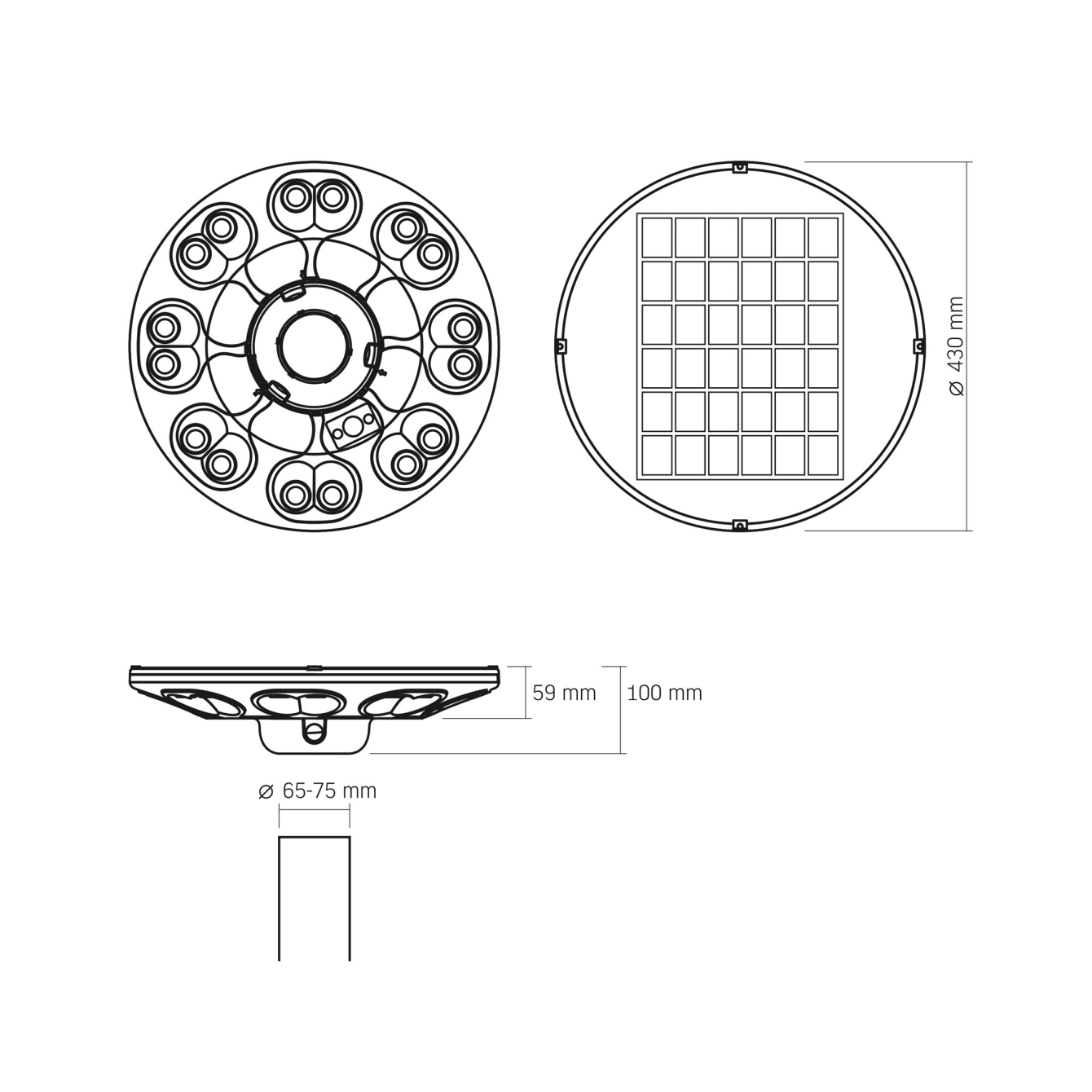 Сонячна панель перетворює сонячне світло в електрику і заряджає акумулятор. Схема контролю освітлення автоматично заряджатиме акумулятор протягом дня (>10 люкс) і розряджатиме вночі (<5-10 люкс). Навколишня температура при зарядці вище 0°С, під час роботи (розряджанні) вище -10°С.