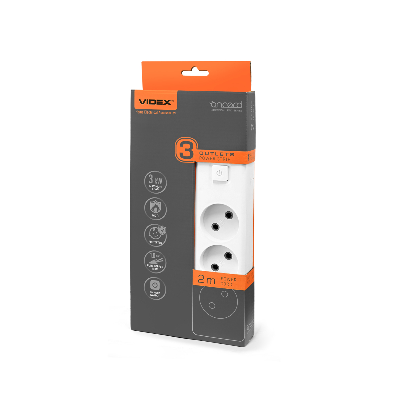 ПОДОВЖУВАЧ МЕРЕЖЕВИЙ VIDEX ONCORD - сучасний пристрій для дому та офісу, призначений для повсякденного використання. Стане в нагоді, коли необхідно підключити декілька електроприладів до однієї розетки. Являє собою подовжувач з 3-ма розетками змінного струму без заземлення. На виробі присутній вимикач у вигляді кнопки, що дозволяє легко вимикати електричні пристрої без необхідності виймати їх з розетки. Виглядає стильно та сучасно в будь якому інтер'єрі, а головне надійний та безпечний. Корпус виготовлений з вогнестійкого (760°C) пластику - поліпропілену (PP), а контакти зроблені з міді та латуні. Довжина кабелю складає 2м. Подовжувач також має захист від дітей, який передбачає додаткові захисні шторки в гнізді розеток змінного струму. Клас захисту виробу – ІР20, тому його можна використовувати лише в сухих приміщеннях. Виконує функцію подовжувача і не є мережевим фільтром. Гарантія становить 2 роки.