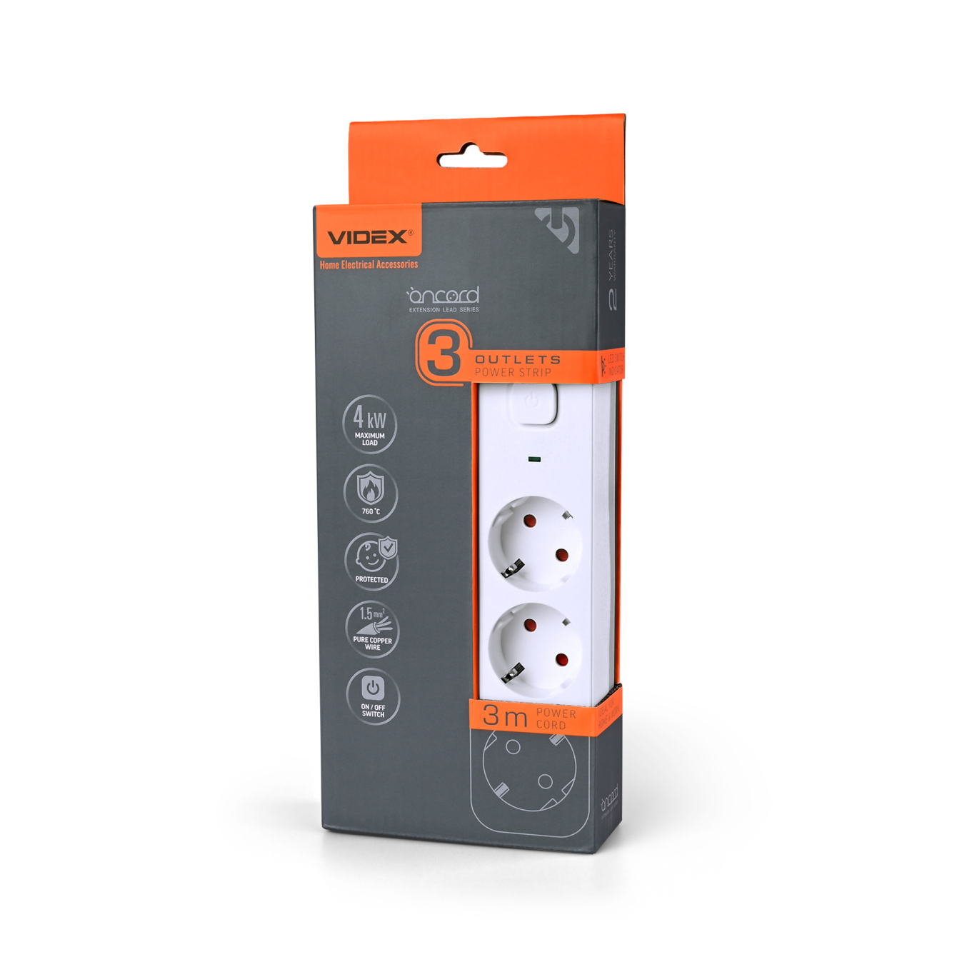 МЕРЕЖЕВИЙ ПОДОВЖУВАЧ VIDEX ONCORD - сучасний пристрій для дому та офісу призначений для повсякденного використання. Являє собою подовжувач з 3-ма розетками змінного струму із заземленням (тип EU). Виглядає стильно та сучасно в будь якому інтер'єрі, а головне надійний та безпечний. Корпус виготовлений з вогнестійкого (750°C) пластику - поліпропілену (PP), а контакти зроблені з міді та латуні з нікелевим покриттям. Трижильний кабель виготовлений з високоякісної міді і покритий товстим шаром PVC для захисту від пошкодження, довжина складає 3м. Подовжувач також має захист від дітей, який передбачає додаткові захисні шторки в гнізді розеток змінного струму. Гарантія становить - 2 роки.