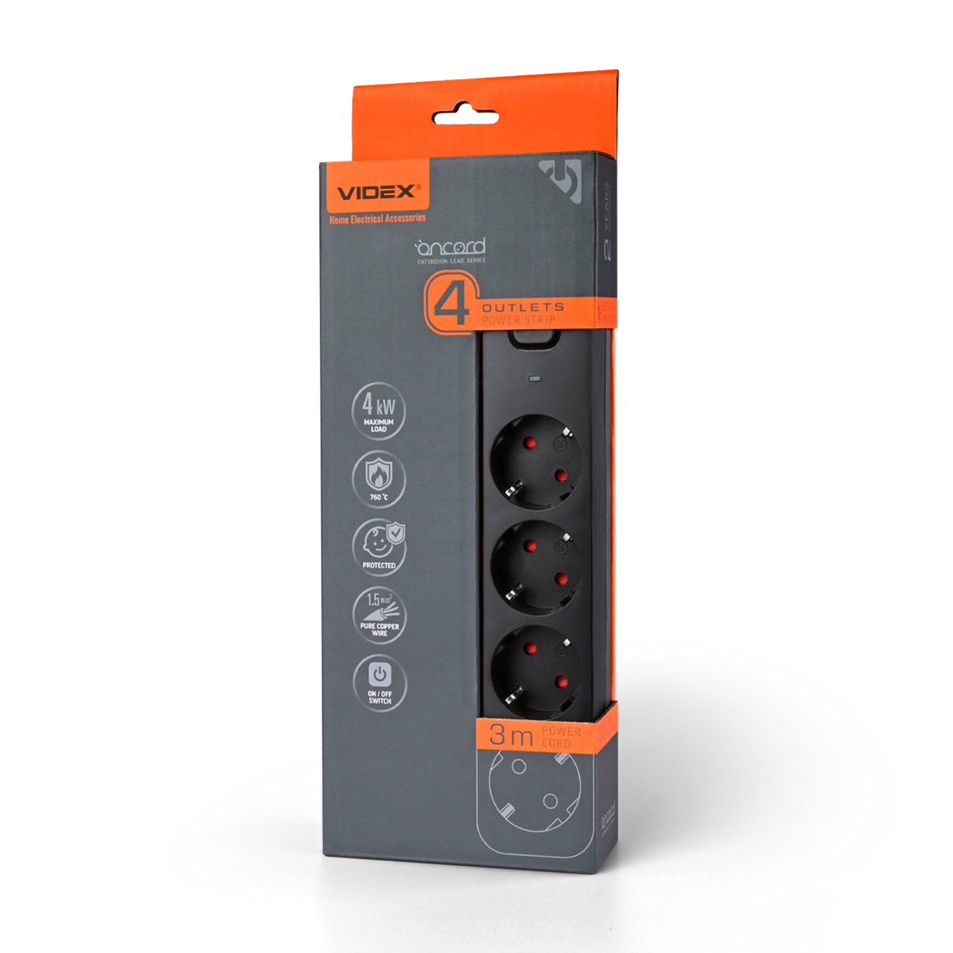 МЕРЕЖЕВИЙ ПОДОВЖУВАЧ VIDEX ONCORD - сучасний пристрій для дому та офісу призначений для повсякденного використання. Являє собою подовжувач з 4-ма розетками змінного струму із заземленням (тип EU). Виглядає стильно та сучасно в будь якому інтер'єрі, а головне надійний та безпечний. Корпус виготовлений з вогнестійкого (750°C) пластику - поліпропілену (PP), а контакти зроблені з міді та латуні з нікелевим покриттям. Трижильний кабель виготовлений з високоякісної міді і покритий товстим шаром PVC для захисту від пошкодження, довжина складає 3м. Подовжувач також має захист від дітей, який передбачає додаткові захисні шторки в гнізді розеток змінного струму. Гарантія становить - 2 роки.