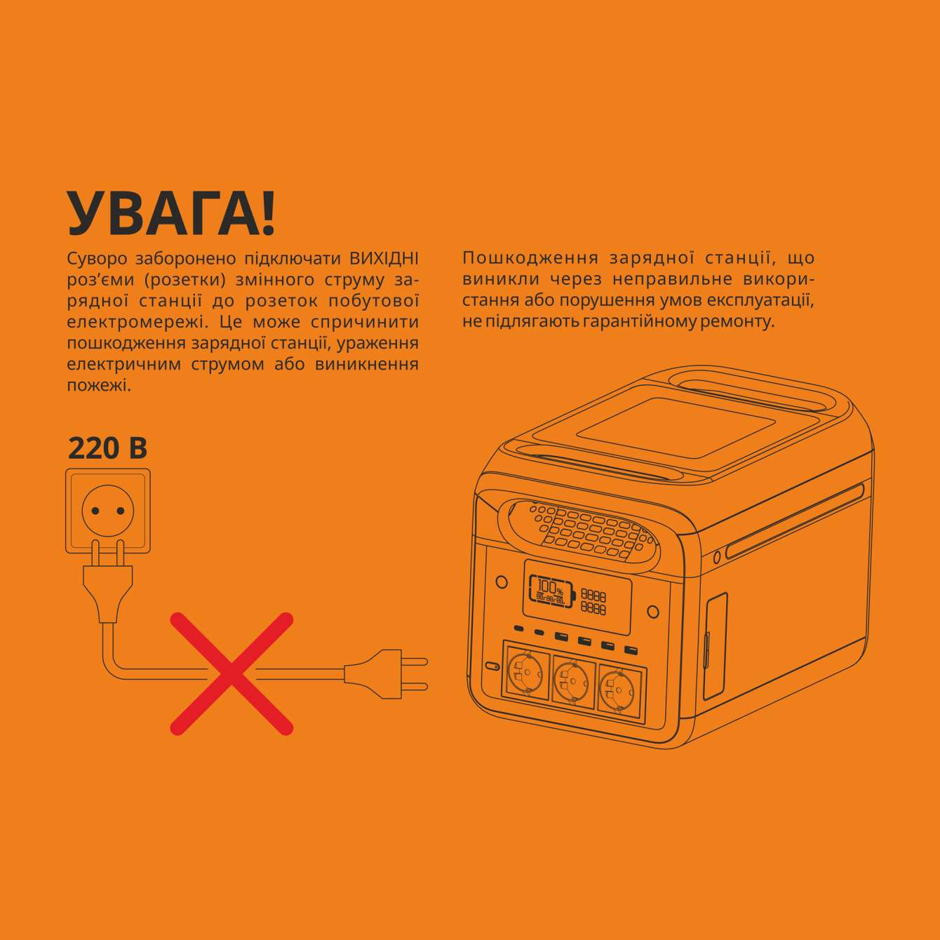 УВАГА! Суворо заборонено підключати ВИХІДНІ роз‘єми (розетки) змінного струму зарядної станції до розеток побутової електромережі. Це може спричинити пошкодження зарядної станції, ураження електричним струмом або виникнення пожежі. Пошкодження зарядної станції, що виникли через неправильне використання або порушення умов експлуатації, не підлягають гарантійному ремонту!