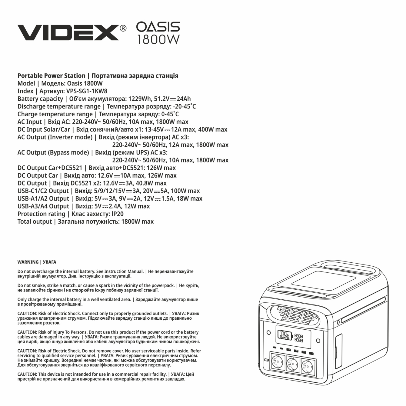 Портативна зарядна станція VIDEX OASIS 1800W 1229Wh (VPS-SG1-1KW8) являє собою джерело безперебійного живлення великої ємності, потужності якої буде достатньо для заряджання мобільних пристроїв, ноутбуків, освітлення, малопотужних побутових приладів, інструментів середньої потужності та короткочасного живлення енергоємних пристроїв. Використовується в якості резервного джерела живлення для дому, ресторану чи кафе, офісу, а також в якості джерела живлення в місцях де не має електромережі.