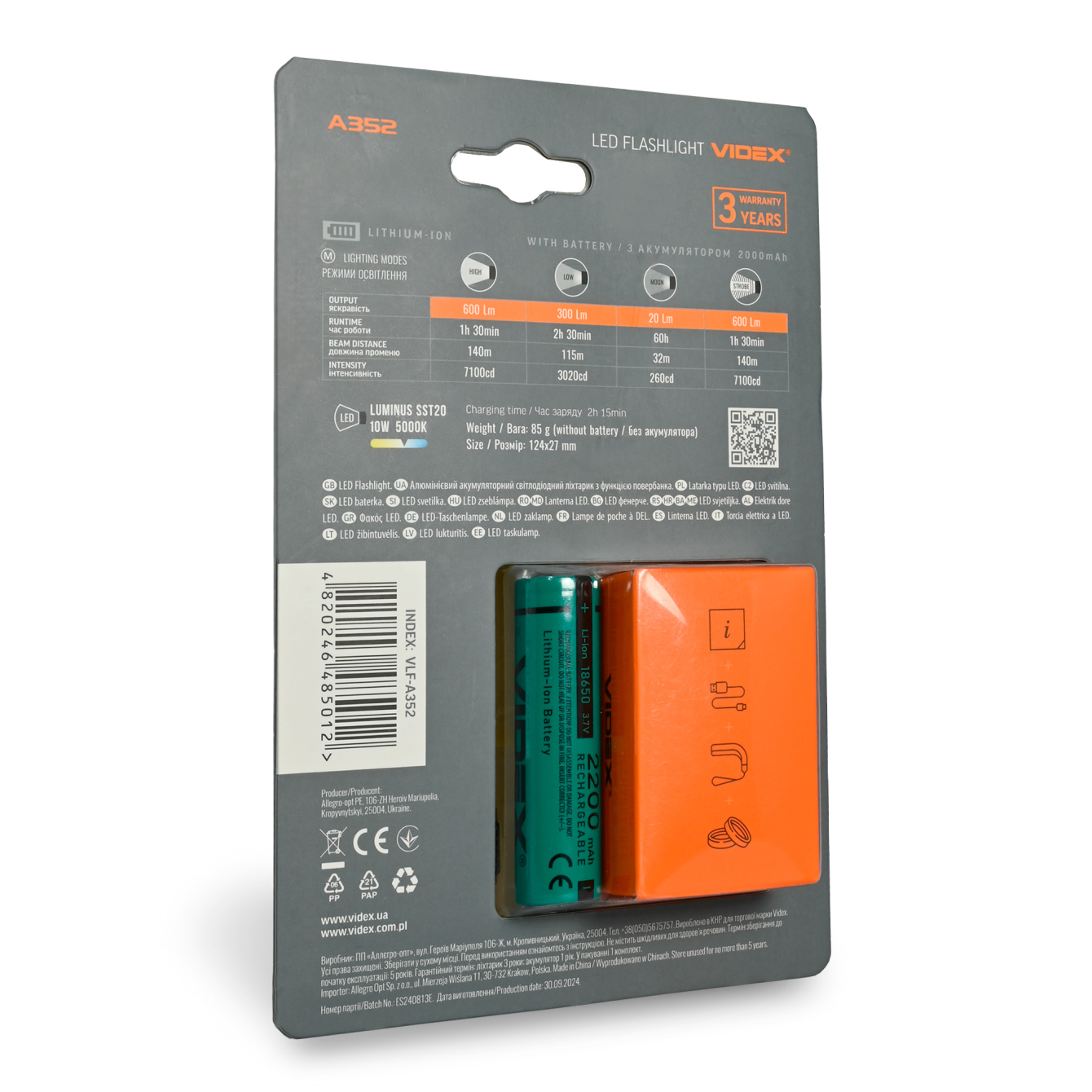 Портативний світлодіодний ліхтарик VIDEX VLF-A352 600Lm 5000K призначений для індивідуального використання в темний час доби або в приміщеннях без освітлення. Основними показниками є герметичність, надійний корпус, дальність світла. Дозволяє обрати необхідний режим роботи. Використовується шнур для ліхтаря, що забезпечує зручне користування і транспортування. В комплект також йде кліпса, за допомогою якої ліхтарик можна носити на рюкзаку, ремені, бейсболці та інших місцях, де це можливо. Також від ліхтаря можна заряджати інші пристрої. Особливістю даної моделі є наявність виходу USB-A (5В, 1А) на корпусі ліхтаря для підзарядки телефону та інших гаджетів в екстрених випадках за потреби.