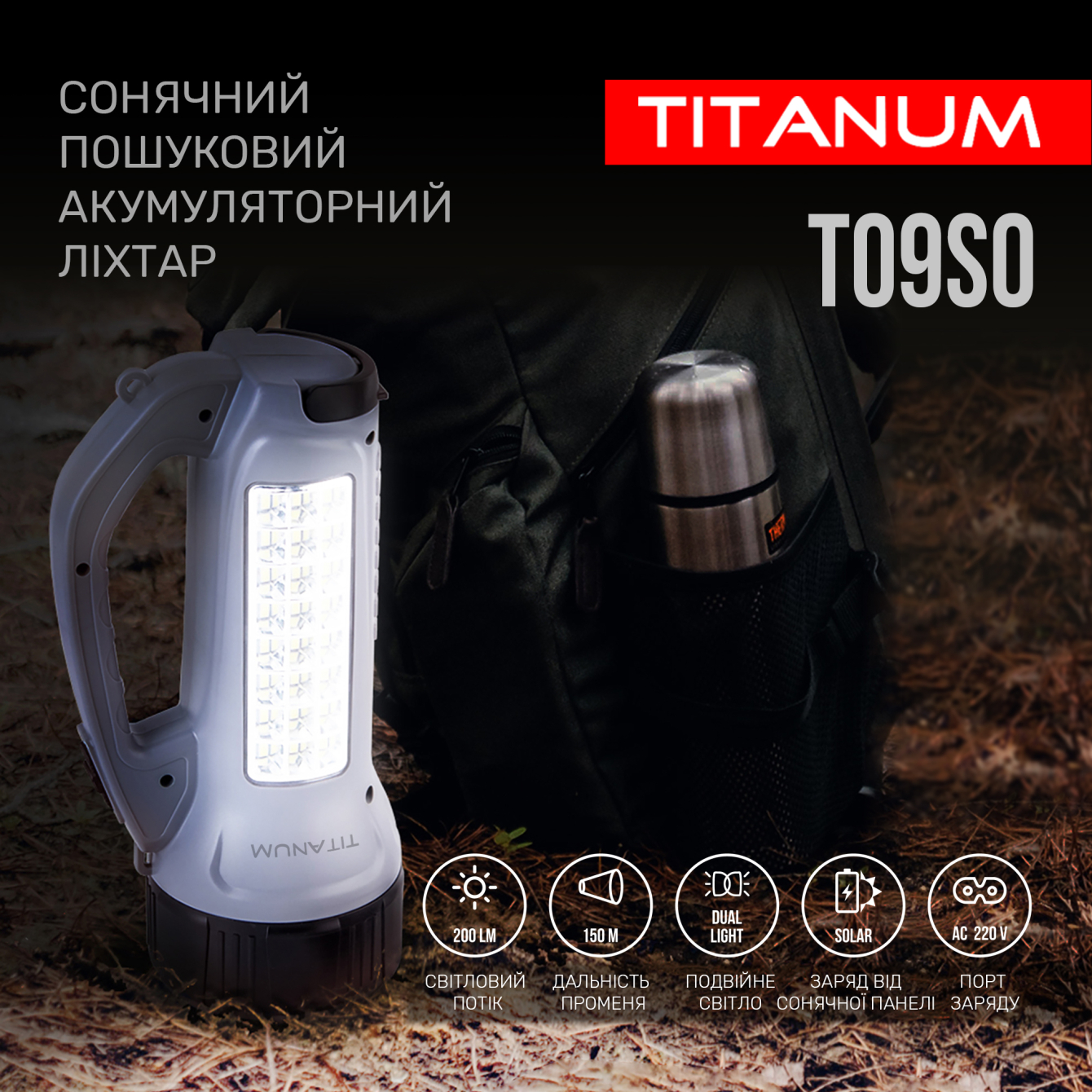 Сонячний пошуковий ліхтар з акумулятором «Titanum» призначений для використання у темну пору доби або в приміщеннях без освітлення. Має зручну ергономічну ручку для переносу, вбудовану сонячну панель та працює від акумулятора. Особливістю даної моделі є два джерела світла: переднє (основне) та бокове, яке використовують переважно для ближнього освітлення. Підходить для застосування у побуті, риболовлі чи туризмі.