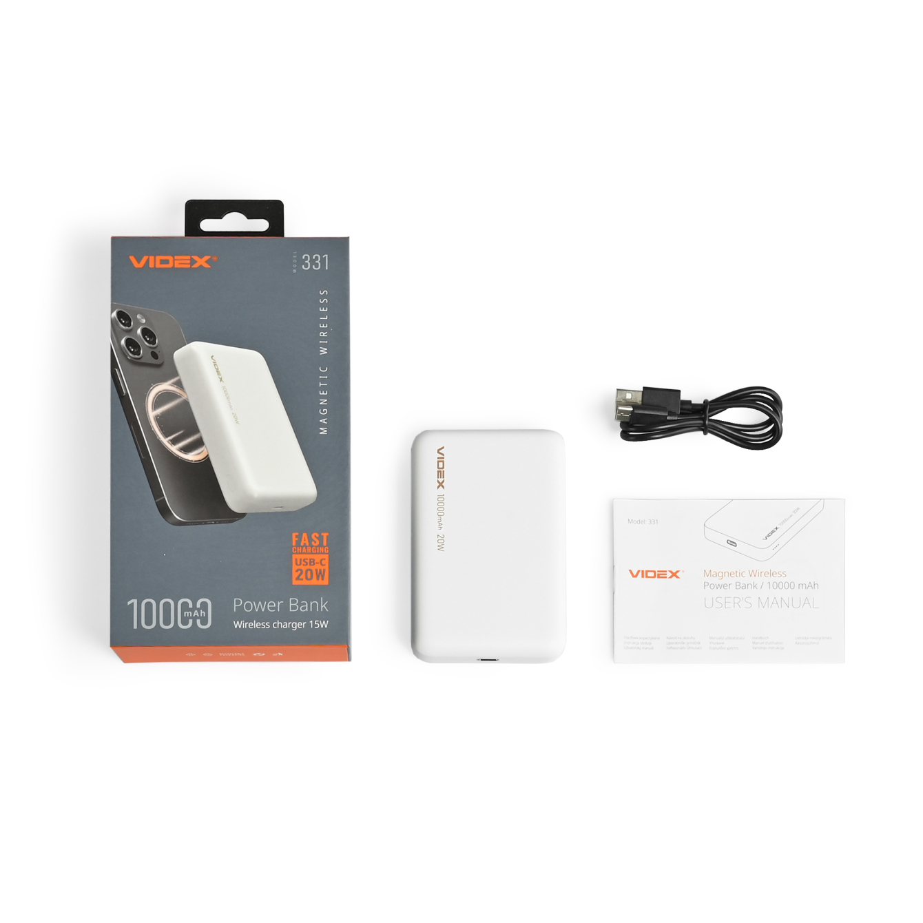 Повербанк VIDEX VPB-331 з бездротовою зарядкою потужністю 15W, має ємність 10000mAh і максимальну вихідну потужність PD20W. Цей акумулятор оснащений літій-полімерною батареєю 3.85V (38.5Wh), що дозволяє заряджати телефони, планшети, смарт-годинники та працювати бездротовим зарядкам з високою швидкістю завдяки підтримці технології Power Delivery (PD) до 20W. Також повербанк підтримує бездротову зарядку з максимальною потужністю 15W та сумісна з 10W, 7.5W, 5W. Вона розташована на задній частині корпусу та виділена спеціальним магнітним кільцем для простої та надійної фіксації телефону під час зарядки. Підтримує MagSafe для продукції Apple. Коли бездротова зарядка активна та працює, світиться червоний індикатор.