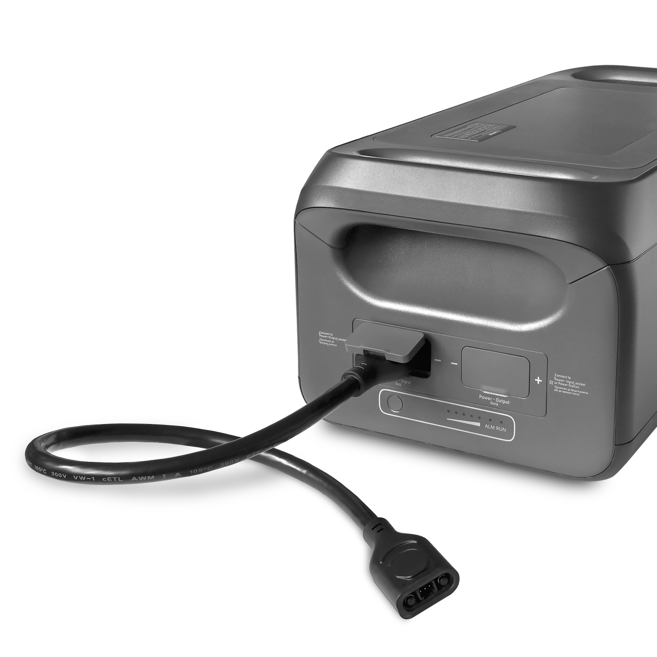 2) Вставте один кінець кабелю у ВХІДНИЙ роз'єм зарядної станції, а інший – у ВИХІДНИЙ роз’єм розширювального акумулятора.