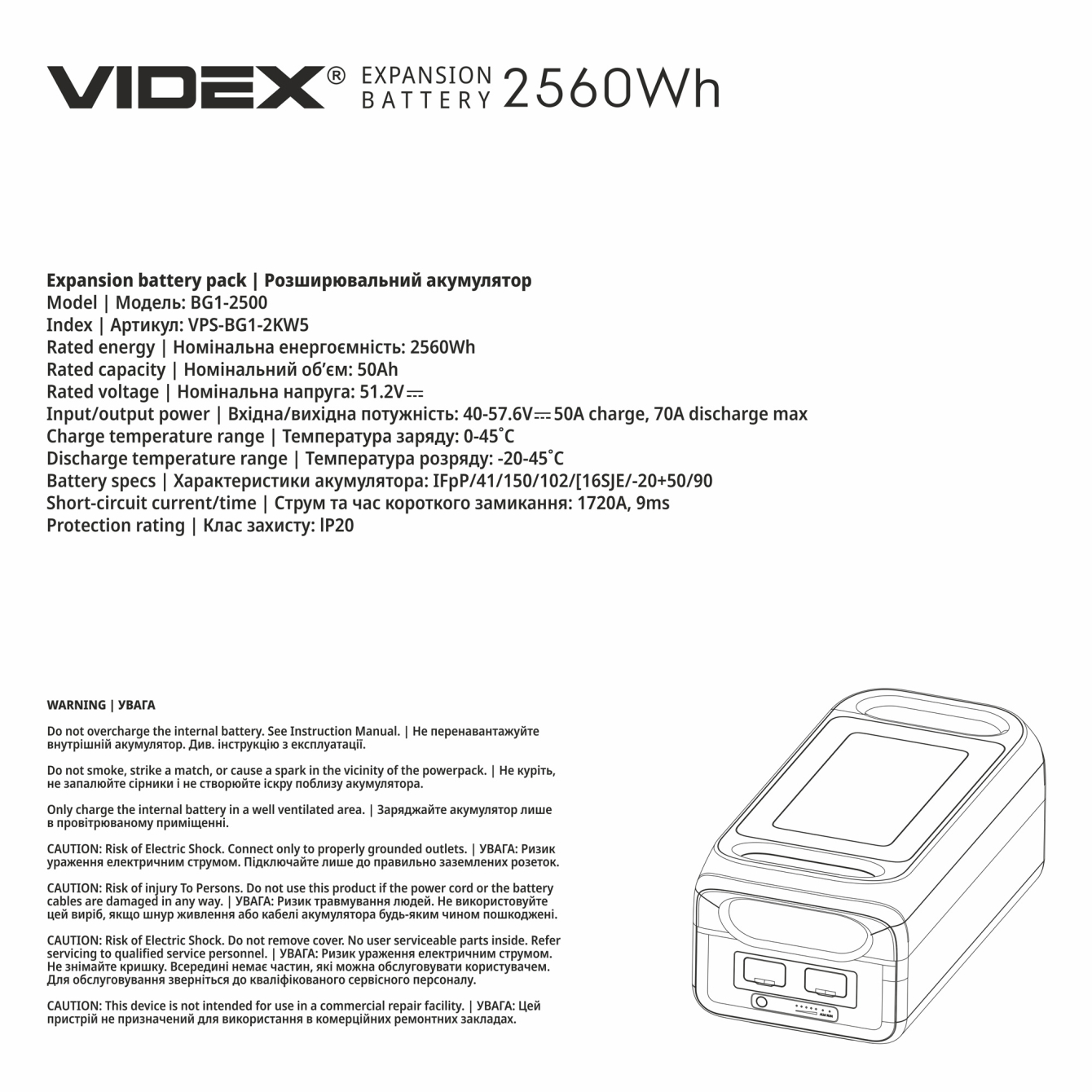 Розширювальний акумулятор VIDEX BG1-2500 2560Wh (VPS-BG1-2KW5)