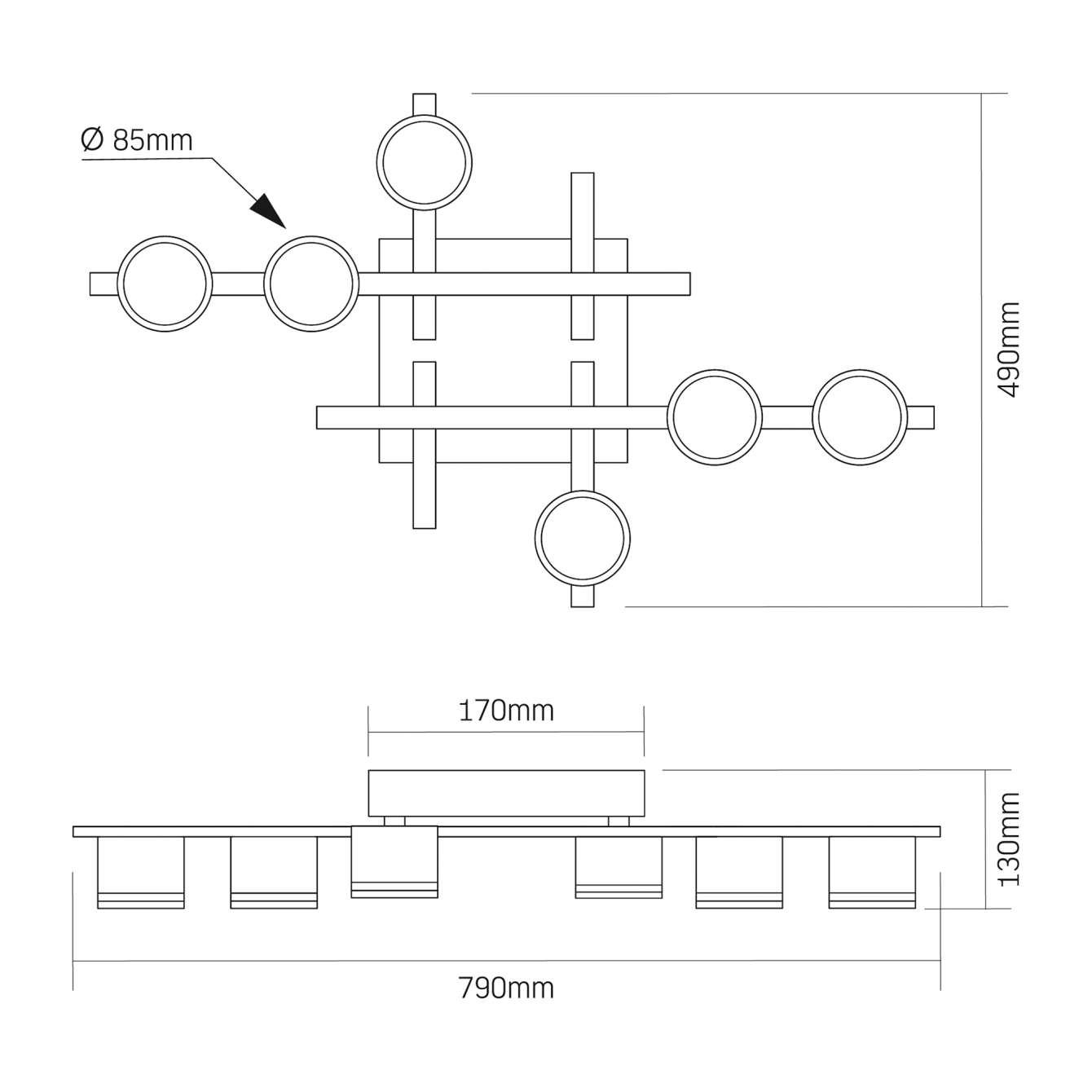 В якості джерела світла в даній моделі використовуються 6 лампочок з цоколем GX53 і максимальною потужністю до 30W кожна. Габаритні розміри складають: основа - 170х170x45мм, планки довжиною 278мм (2шт) та 523мм (2шт), а голова світильника має діаметр 85мм і висоту 65мм кожна (6шт). Загальна довжина світильника складає 790мм, ширина 490мм, а висота 130мм.