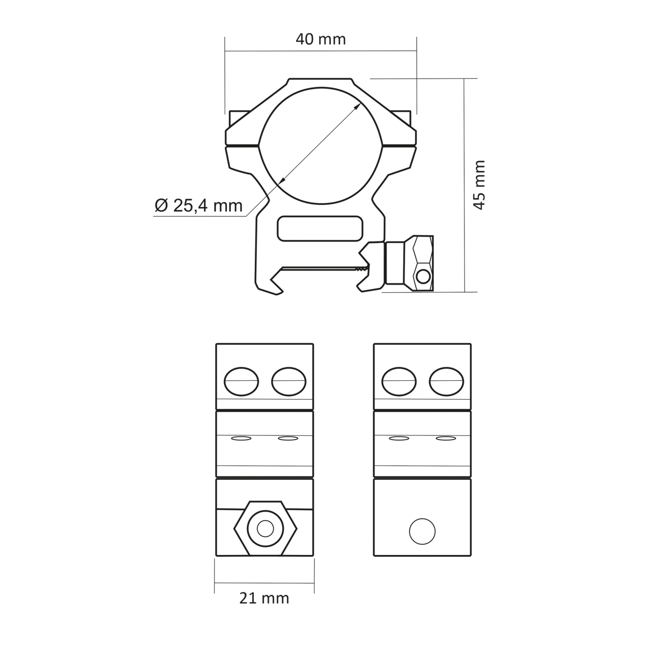 Тактичне кріплення - призначене для монтажу оптичного прицілу, ліхтаря чи оптики на зброю з відповідним профілем кріплення на планку Пікатінні або Вівера (Picatinny / Weaver) - 21мм. Виготовлено із авіаційного анодованого алюмінію. Діаметр кільця кріплення - 25,4мм. Вага - 48г. Шестигранний ключ для затягування додається у комплекті. Габаритні розміри - 21mm x 40mm x 45mm (ДхШхВ).